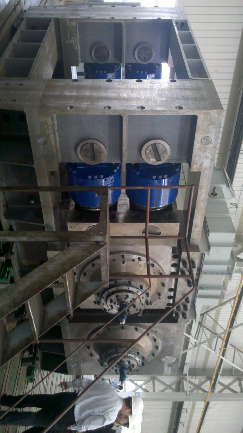 該輥壓機(jī)的規(guī)格為T(mén)RP140X140,通過(guò)量為500—560t/h。中材裝備集團(tuán)在理論和試驗(yàn)研究的基礎(chǔ)上,并結(jié)合鋼渣的特性,對(duì)本輥壓機(jī)進(jìn)行了重新開(kāi)發(fā)設(shè)計(jì),在壓輥結(jié)構(gòu)和加壓模式等方面進(jìn)行了創(chuàng)新從而提高了可靠性,為高效超細(xì)粉碎鋼渣提供了一條新技術(shù)路線(xiàn)。