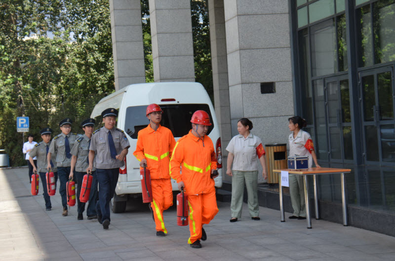 15點,消防疏散演習(xí)正式開始,義務(wù)消防隊員著防火服對起火點進行模擬滅火,并模擬撥打119報火警,大廈內(nèi)拉響火警警報,員工從疏散樓梯迅速疏散撤離,到指定地點集合,完成預(yù)定演習(xí)計劃。