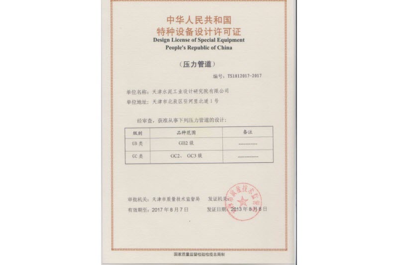 8月8日,中材國際天津公司正式獲得天津市質(zhì)量技術(shù)監(jiān)督局頒發(fā)的壓力管道設(shè)計(jì)許可證書,為相關(guān)業(yè)務(wù)的開展奠定了良好基礎(chǔ)。