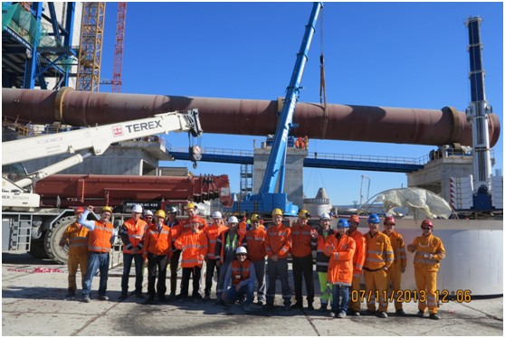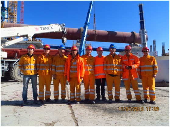 回轉(zhuǎn)窯吊裝的順利合攏,得到了業(yè)主及監(jiān)理的一致好評(píng),意大利水泥歐洲區(qū)總經(jīng)理Fabrizio Donega,CTG副總經(jīng)理Matel Maconi及Devnya水泥廠總經(jīng)理Serge Schmidt專程趕到現(xiàn)場(chǎng)向我們表示祝賀。大家在現(xiàn)場(chǎng)合影,每個(gè)人的臉上都洋溢著開心的笑容。此后,業(yè)主項(xiàng)目經(jīng)理Massimo Della Gora特意到項(xiàng)目部再次向大家表示感謝與祝賀。