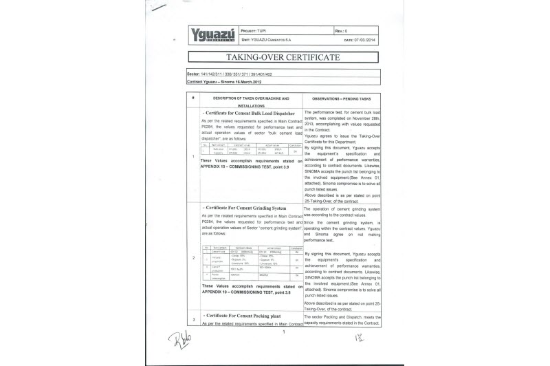 3月8日,Intercement水泥公司巴拉圭Tupi項(xiàng)目經(jīng)理Ruben Lobo先生與公司巴拉圭Tupi項(xiàng)目經(jīng)理張北國(guó)先生共同簽定了該項(xiàng)目水泥粉磨發(fā)運(yùn)系統(tǒng)接受證書(shū),標(biāo)志著該系統(tǒng)施工、安裝、調(diào)試工作圓滿結(jié)束并正式進(jìn)入一年質(zhì)保期。得益于公司領(lǐng)導(dǎo)英明的決策、各部門(mén)各單位團(tuán)結(jié)緊密的工作、現(xiàn)場(chǎng)項(xiàng)目部科學(xué)的安排和掌控,試運(yùn)行期間,水泥粉磨系統(tǒng)各項(xiàng)參數(shù)都明顯優(yōu)于合同性能保證條款中各項(xiàng)參數(shù)界定,性能卓越,達(dá)到國(guó)際國(guó)內(nèi)同類型水泥粉磨系統(tǒng)一流水平。