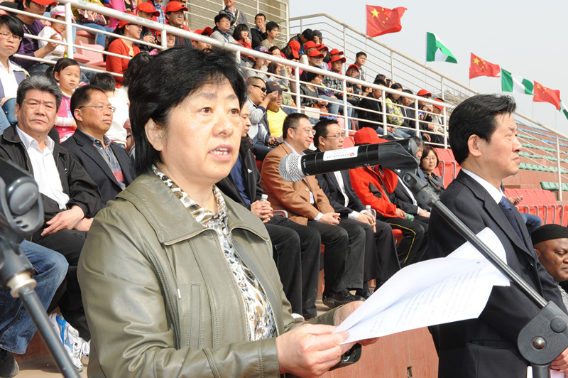 在奏響尼日利亞和中華人民共和國國歌后,張江首先致辭。她說,這次足球邀請賽命名為中材“尼日利亞杯”有著特殊的意義,中國與尼日利亞建交43周年來,兩 國關(guān)系一直健康順利地發(fā)展。中尼兩國之間蓬勃發(fā)展的經(jīng)濟貿(mào)易勢頭,為中材集團在尼日利亞的發(fā)展提供了支持,集團旗下的企業(yè)在尼日利亞建設(shè)水泥工程的同時, 積極履行作為聯(lián)合國契約組織成員的社會責(zé)任,尊重當(dāng)?shù)厝嗣耧L(fēng)俗習(xí)慣,支援當(dāng)?shù)厣鐓^(qū)建設(shè),熱心公益事業(yè),為當(dāng)?shù)厣鐓^(qū)捐款,贏得了當(dāng)?shù)匕傩盏暮迷u。張江認(rèn)為這 次足球賽冠名“尼日利亞杯”,也表達了中材集團對尼日利亞人民的深厚情誼。最后,她希望各參賽隊共同努力,讓每一場比賽都精彩、難忘。
