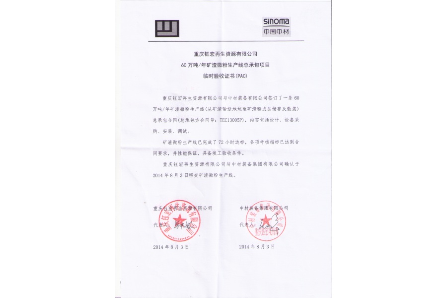 近日,由中材裝備集團總承包(EPC)的重慶鈺宏60萬噸/年渣微粉生產線項目獲得業(yè)主頒發(fā)的臨時驗收證書(PAC),標志著該項目建設階段工作的全部結束。