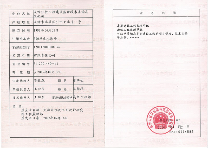 近日,天津水泥工業(yè)設(shè)計(jì)研究院有限公司下屬的仕敏監(jiān)理公司順利通過(guò)了房屋建筑工程專業(yè)甲級(jí)、冶煉工程甲級(jí)資質(zhì)的審批。