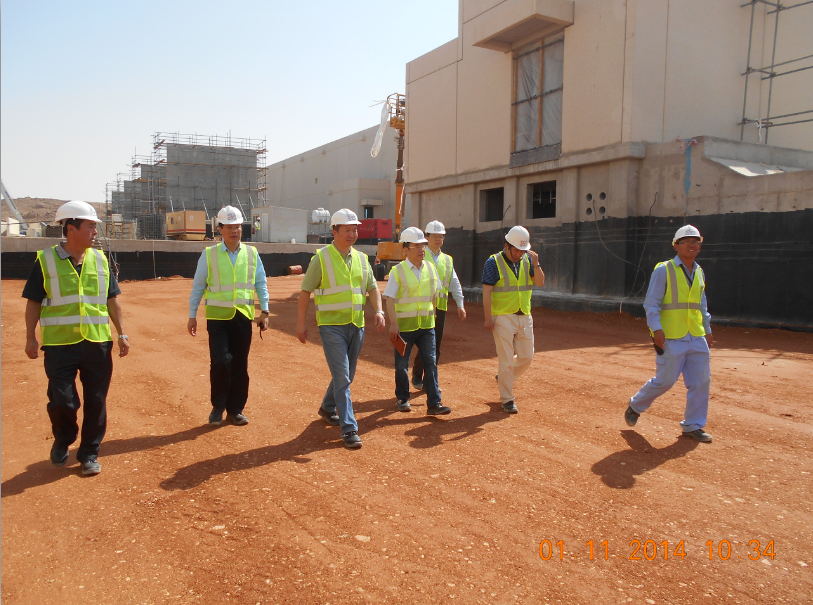 宋董事長(zhǎng)一行抵達(dá)沙特首都利雅得后,不顧酷熱和勞頓,奔赴EICO公司位于利雅得市郊的AlKharj 2項(xiàng)目現(xiàn)場(chǎng)。在EICO公司首席運(yùn)營(yíng)官趙崗及項(xiàng)目經(jīng)理趙丹輝的陪同下,宋董事長(zhǎng)、夏總裁、蔣副總裁等領(lǐng)導(dǎo)對(duì)整個(gè)電站建筑區(qū)、營(yíng)地區(qū)域做了深入細(xì)致的了解,并對(duì)現(xiàn)場(chǎng)的施工管理及安全生產(chǎn)工作進(jìn)行了認(rèn)真的檢查并提出指導(dǎo)意見(jiàn)。在聽(tīng)取了現(xiàn)場(chǎng)的項(xiàng)目管理和安全生產(chǎn)情況的匯報(bào)后,領(lǐng)導(dǎo)們對(duì)于Al Kharj-2項(xiàng)目所取得的成績(jī),以及EICO公司在施工本地化、管理國(guó)際化方面所做的嘗試與努力,表示了充分的肯定,并殷切期望EICO公司能夠充分依托當(dāng)?shù)氐馁Y源和國(guó)內(nèi)的支持,不斷提升自己的業(yè)務(wù)水平,盡快適應(yīng)新的行業(yè)環(huán)境,取得更好的成績(jī)。
