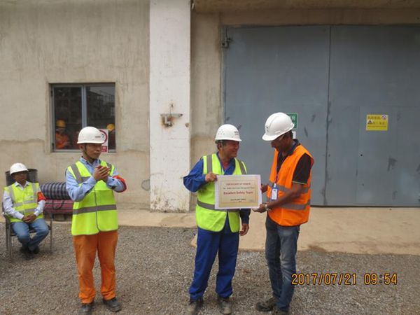 項(xiàng)目安全管理工作取得的成績(jī)贏得了海德堡業(yè)主的高度認(rèn)可,在7月21日組織的“現(xiàn)場(chǎng)安全表彰暨水泥系統(tǒng)生產(chǎn)運(yùn)行剪彩儀式”上,業(yè)主高層對(duì)CILU項(xiàng)目管理團(tuán)隊(duì)進(jìn)行了表彰。海德堡高層和CILU工廠廠長(zhǎng)親自向項(xiàng)目部頒發(fā)了安全生產(chǎn)優(yōu)秀集體榮譽(yù)證書,并給項(xiàng)目安全經(jīng)理頒發(fā)“海德堡終身安全榮譽(yù)員工”證書。儀式上,業(yè)主和項(xiàng)目部領(lǐng)導(dǎo)還共同剪開寫滿全員安全承諾的彩帶。