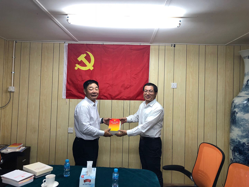 趙惠鋒傳達(dá)了集團(tuán)紀(jì)委境外機(jī)構(gòu)及工程項目廉潔風(fēng)險防控調(diào)研匯報工作專題會會議精神,結(jié)合集團(tuán)黨委《關(guān)于加強(qiáng)境外單位(項目)黨建工作的實施意見》,為現(xiàn)場黨員和提交入黨申請書的積極分子講授了專題黨課,對現(xiàn)場開展境外黨建工作,落實“兩個責(zé)任”提出明確要求:一是要認(rèn)真學(xué)習(xí)黨章,黨章作為黨的總章程和根本大法,是全黨必須遵循的總規(guī)矩,必須熟悉黨員的權(quán)利和義務(wù),要創(chuàng)新方式,通過自學(xué)、知識問答等方式選擇適合境外現(xiàn)場的方式方法。二是健全境外黨組織,按照黨章規(guī)定,凡三人以上的黨員均可成立黨支部,通過落實“三會一課”制度,加強(qiáng)基層組織建設(shè)工作,鞏固基層黨組織陣地,做到項目建設(shè)到哪里、黨組織就組建到哪里、黨員作用就發(fā)揮到哪里。三是發(fā)揮境外黨組織政治保障作用。通過加強(qiáng)境外黨建工作,團(tuán)結(jié)幫助群眾,開展豐富多彩的黨建活動,組織學(xué)習(xí),把項目現(xiàn)場黨支部建設(shè)成思想先進(jìn)、作風(fēng)優(yōu)良、有朝氣、有活力的基層組織隊伍,充分發(fā)揮黨組織的戰(zhàn)斗堡壘和黨員的先鋒模范作用。會上,趙惠鋒還向現(xiàn)場黨員贈送了黨建學(xué)習(xí)書籍。
